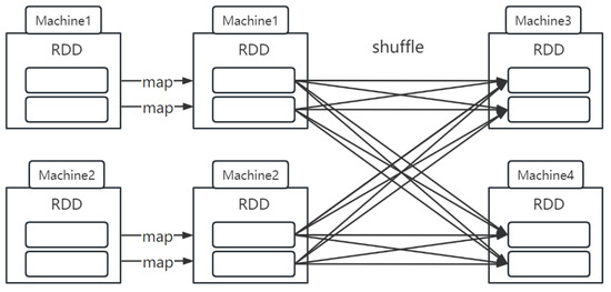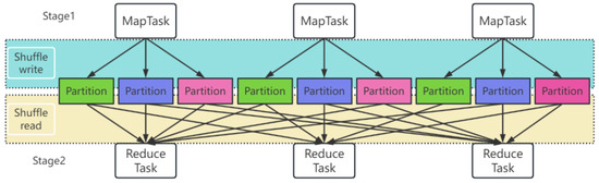 Spark is a fast, universal, scalable and highly available big data analysis search engine developed based on Scala. It has upgraded its performance based on the MapReduce model. Developers can deploy Spark on a large number of servers to form clusters that efficiently process data. The core technology of Spark is the use of resilient distributed datasets (RDD) [9]. The data are distributed in the form of RDD on each server for management, to achieve data parallelization and distributed processing. During the data repartitioning process of the Spark task, if data are moved across nodes, Shuffle is generated, as shown in Figure 1. Shuffle is a bridge between Map and Reduce. It corresponds the Map output to the Reduce input and involves serialization and deserialization, cross-node network I/O and disk read/write I/O. If a complex service logic has Shuffle, the next stage can be executed only after the previous stage produces a result. In the mass data Join task of distributed architecture, the data interaction between servers will inevitably generate Shuffle, which means a large number of serialization–deserializations, cross-node network I/Os and disk read and write I/Os.
