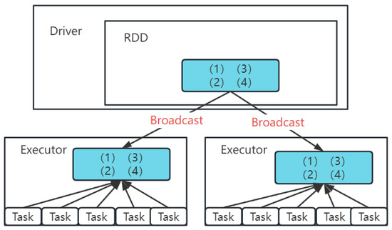 The broadcast variable means that one variable is sent to memory on each Executor node associated with the cluster task, as shown in Figure 5. Data information is broadcast to each Executor node, serialized as it is fetched, and deserialized as it is used. Spark tasks can directly read data information from the Executor memory of the local node to prevent data interaction between different tasks from generating a large cross-node network I/O.