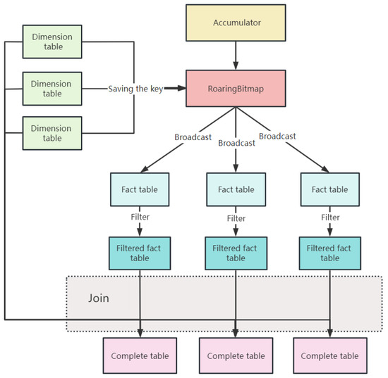 The execution flow of Join for the optimization scheme in this paper is shown in Figure 8. We first create an accumulator and load the RoaringBitmap into it, and then collect the dimension table data keys into the accumulator of the type RoaringBitmap. The RoaringBitmap is broadcast to each node as a Spark broadcast variable and stored in memory. In the filtering phase, each cluster node reads the Key stored in the RoaringBitmap and matches the Key of the current fact table. If the Key of the fact table does not match the value, the data will be deleted. Through the above method, a fact table without redundant data is obtained, and then we Join the data. There are no redundant data in the fact table to enter the Shuffle phase, so as to avoid unnecessary data interaction, network transmission and disk reading and writing generated by Shuffle write and Shuffle read. Thus, efficient and energy-efficient Spark Join tasks can be achieved.