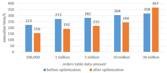 The data volume of the orders table used in the experiment was 7 million, and the data volume of the lineitem table was 50 million, 100 million, 500 million, 1 billion and 1.5 billion, respectively. The orders table has a many-to-many data association with the lineitem table. The Spark distributed computing query framework is still used to read Hive data and run it on Yarn for the Join operation. Five experiments were conducted to obtain the average value of each group’s data. After pre-filtering, the execution time of the Join task decreased more with an increasing amount of data. The rate of time reduction was 15.1%, 17.0%, 19.7%, 22.0% and 25.2%, respectively. The experimental results are shown in Figure 11.