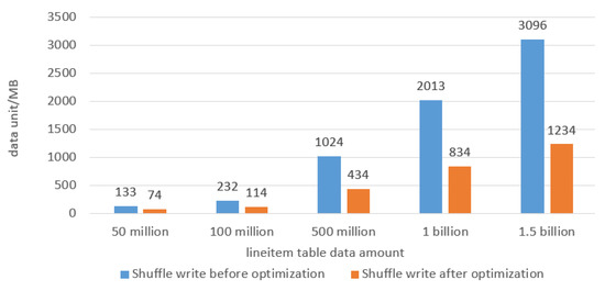 In addition to the task running speed, we also recorded the Shuffle write data in the Join process. The data volume before optimization was 133 MB, 232 MB, 1024 MB, 2013 MB and 3096 MB, and the data volume after optimization was 74 MB, 114 MB, 434 MB, 834 MB, and 1234 MB, respectively. In the Join process, as the data volume of the optimized Shuffle write task increased, the data volume written to the disk decreased by 44.3%, 50.8%, 57.6%, 58.5% and 60.1%, respectively. The experimental results are shown in Figure 12.
