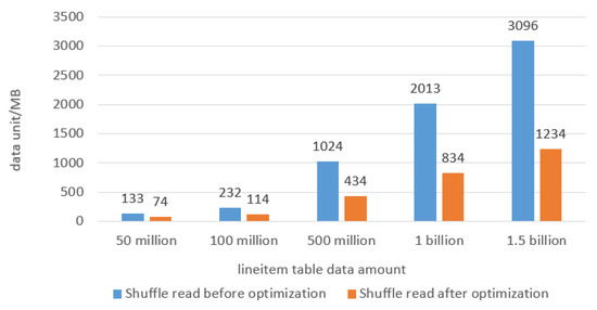 During Shuffle write, there is also a corresponding Shuffle read. Shuffle read data were recorded in the experiment. Before optimization, Shuffle read 133 MB, 232 MB, 1024 MB, 2013 MB and 3096 MB from the disk. After optimization, Shuffle read 74 MB, 114 MB, 434 MB, 834 MB and 1234 MB, respectively. In the Join process, as the data volume of the optimized task increased, the data volume read by Shuffle read decreased by more. The data read from the disk decreased by 44.3%, 50.8%, 57.6%, 58.5% and 60.1%, respectively. The experimental results are shown in Figure 13.