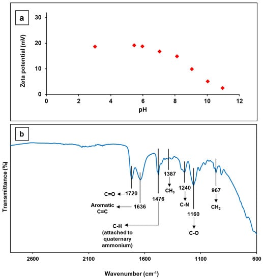 (a) The zeta potential (mV) for pH range 3–11, and (b) FTIR spectrum of MIEX® GOLD resin.
