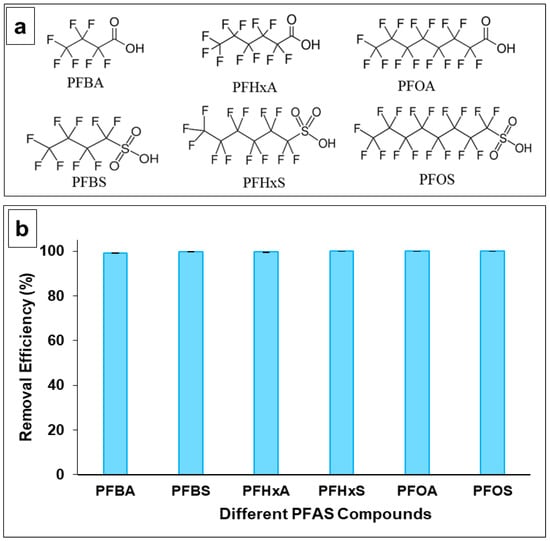 (a) Chemical structure of different PFAS compounds, and (b) Removal efficiency of MIEX® GOLD resin for PFBA, PFBS, PFHxA, PFHxS, PFOA, and PFOS.