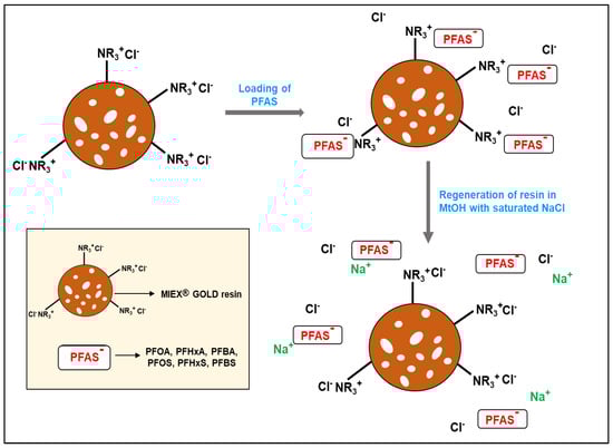 Figure 4 shows the schematic illustration of PFAS adsorption onto MIEX® GOLD resin. Negatively charged PFAS compounds in water can bind to the positively charged quaternary ammonium ion on the binding site of the resin surface by exchanging with the chloride ion. This ionic exchange caused the successful removal of PFAS compounds from contaminated water. This underlying mechanism of PFAS removal by MIEX® GOLD resin is similar to that of dissolved organic carbon removal by this resin []. The regeneration of resin is performed in MtOH (methanol) with saturated NaCl. The presence of a Na+ cation attracts the negatively charged PFAS from the positively charged quaternary ammonium ion of resin beads. At the same time, an excess amount of chloride in the solution binds to the positively charged quaternary ammonium ion and helps to replace or desorb the adsorbed PFAS.