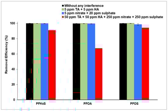 Interference evaluation was also conducted with combined organic and inorganic matter at extremely high concentrations (50 ppm HA + 50 ppm TA + 250 ppm sulfate + 250 ppm nitrate). Each interference test was performed for each PFAS compound separately. All experiments were performed in duplicate and a collected sample aliquot was analyzed by using MS.
