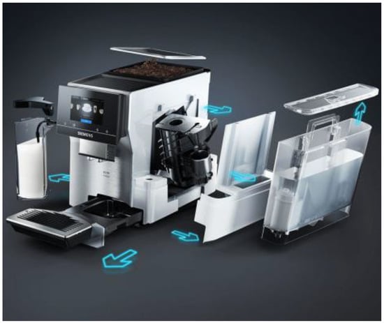 The product assembled on the production line (Figure 1) is a fully automated espresso machine with external dimensions of 400 × 300 × 400 (cm × cm × cm). There are approximately 216 operations composed of 864 steps of time analysis, which need to be completed to assemble the whole product. The process time for assembly is 1102 s.