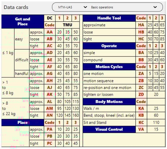 The basic concept of MTM is to decompose a task into its basic human activities, use basic times for them from tables, and combine them into a basic time for the entire task. Several variants of MTM have been developed, differing in their focus. Because of the length of the process time, the MTM Universal Analysis System (MTM-UAS) was chosen in this study (Figure 3). MTM-UAS, which assigns a pre-determined time standard to specific individual process steps, was created to meet manufacturers’ demands for productivity improvement in batch production. Today, it is widely used in the automotive industry []. The categorization MTM-UAS aims for serial production and minimization of the time units used. Sequences of movements and tasks occur regularly and in rapid succession. Taylor and Gilbreth analyzed the ideal workflow from the point of view of efficiency. In addition to the personal skills and abilities of the workers, they emphasized the sequence of work steps as particularly important [].