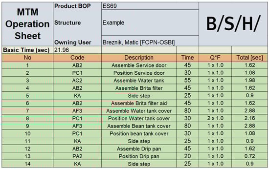 The cycle times of the observed production line range from 60 to 120 s, and the detailed MTM analysis with all the required steps was extensive. To illustrate the application of MTM analysis, a brief example based on a laboratory demonstration of a workstation was prepared and is shown in Figure 4. The example shows 7 assembly operations consisting of 14 assembly steps. For each movement that is performed, the starting position of the worker must be known. Code is then developed based on factors such as the difficulty of grasping and positioning the object, which depend on the size, weight, and type of packaging of the object. Accurately measuring the length of the movement is critical to determining the specific code for each step. Additionally, codes for body motion, including side steps, are used in this example.