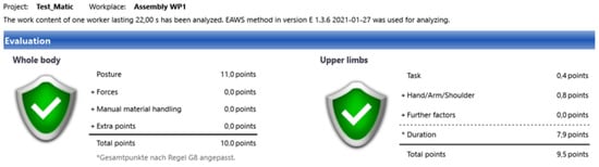 In our analysis, the European Assembly Worksheet (EAWS) was used to assess workers’ posture and movements. EAWS was originally developed for the assessment of assembly work in the automotive industry, where work is performed in short cyclic segments. The EAWS structure consists of the following sections: the general section, the working posture section, action forces, manual material handling, and repetitive upper limb movements. The EAWS index is composed of two values: one related to the whole body and the other to the upper limbs. The risk zones are classified as follows:
