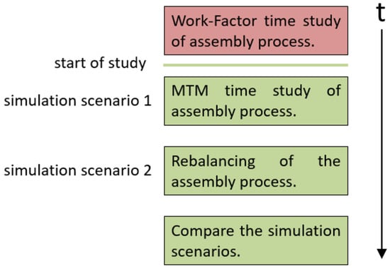 The Work-Factor (WF) system and the Methods-Time Measurement (MTM) system are well known approaches from a group of predetermined times. Both systems have some benefits and obstacles and have undergone many changes and variants over time. The MTM system was first described by Maynard, Stegemerten, and Schwab [] for production process planning. Both approaches, WF and MTM, are based on the assumption that individual basic movements can be performed in the correct sequence more time efficiently and with fewer errors. The time units used are referred to as TMUs (Time Management Units). The components of the process follow each other in a linear sequence, which is reflected in their sequential process.