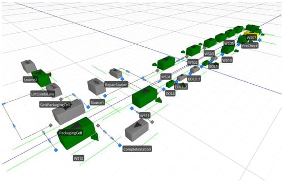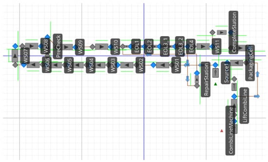 Simio is an object-oriented suite of simulation and planning products []. It is a simulation modeling framework based on smart objects that allow models to be created either using a standard library (for discrete-event simulations) or by allowing the user to create new objects. An object in a library can be a customer or a machine. A model is created by dragging objects into the 2D “Facility” window, connecting them with links to show the flow of entities through the simulated system. Similar to the previously presented software packages, detailed modules can be designed using a property editor. A 3D perspective view is also available for better visualization. The structure of an object in Simio is identical to the structure of a model, and each model is automatically a module that can be used to build hierarchical models. Specific properties (e.g., the machining time of a machine) and states (e.g., idle or busy) can be defined for each inserted object. Simio also provides a set of sophisticated functions for running and analyzing simulation experiments with different scenarios. The Simio simulation package is more widely used than the previous two simulation software packages, but not for assembly lines. It has some applications in logistics [], service planning [], production planning [], and cellular manufacturing [].