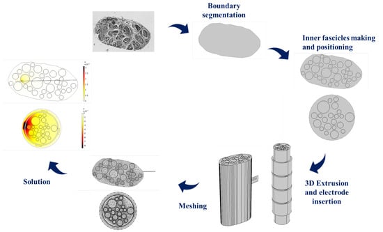 Schematic view of the procedure followed to obtain the FEM model solution, starting from the anatomical image of the median nerve.