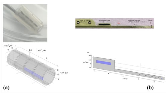 Electrode models: cuff and CAD model (a) and ds−FILE electrode and CAD model (b). Active sites are highlighted in both models.