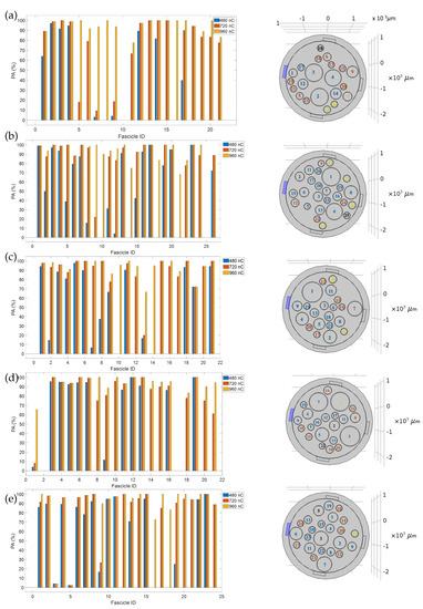 Percentage of activation (PA) vs. fascicle ID for each nerve model (a–e) with cuff electrode developed in Comsol Multiphysics. The electric charge values in the bar plot are the corresponding intensities of electric current values used in the experimental human trial. The histogram indicates the axon fiber percentage of activation in each fascicle at a certain electric charge value. Images on the right represent the nerve section of each model and one active site is highlighted to show the side of the stimulation. Each inner fascicle is labeled using a different color that represents the corresponding electric charge intensity observed in the histogram on the left to activate fibers in that fascicle.