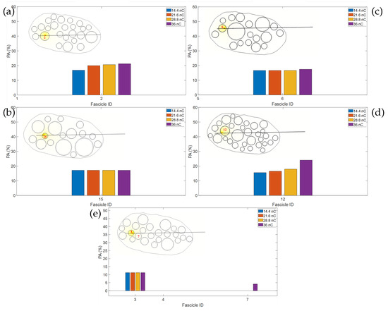 The PA of fascicles in each one of the five nerve models with cuff also depends on the fascicle’s dimension and location. For this reason, it is possible to observe in Figure 3a–e that 7, 17, 13, 11, and 14 fascicles are activated, respectively, with a PA above 10%, when the minimum value is 480 nC, at which the patient perceived the sensation in the experimental trial.
