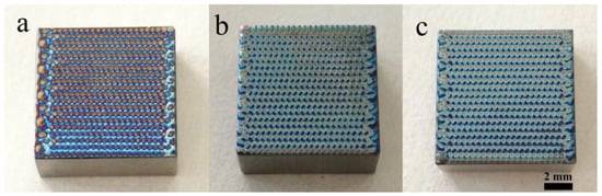 The samples subjected to laser modification are presented in Figure 1. The surface of each sample was significantly modified creating distinct patterns composed of valleys and tops, as already observed [30]. The even textures were obtained by using the overlapping of a laser beam. In addition, blue or dark blue areas were visible on each material, resulting from local surface overheating and oxidation. The appearance of an oxide film on the titanium treated at a sufficient fluence is usual and often reported [9,14,23]. Such behavior can be explained by the oxygen adsorption by metal(s) melted by laser irradiation and eventually the formation of oxides [2].