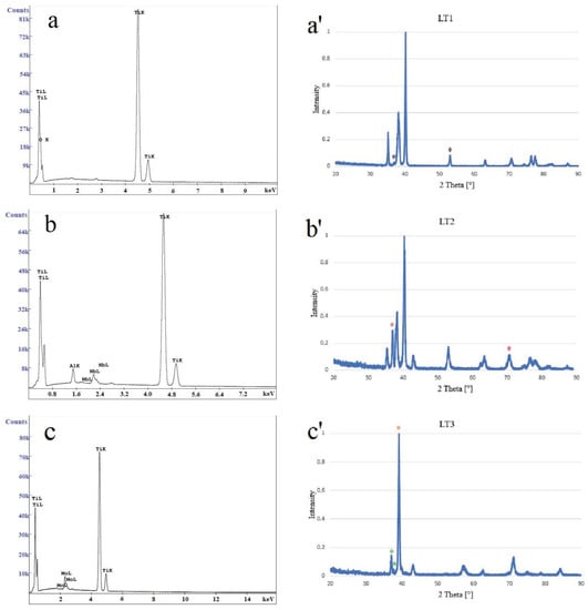 Chemical and phase compositions of surface layers of the laser-processed samples: (a) LT1, (b) LT2, and (c) LT3. EDS: (a’) LT1 (*TiO2), (b’) LT2 (*Nb2O5), and (c’) LT3 (*MoO2 and MoO3). XRD.