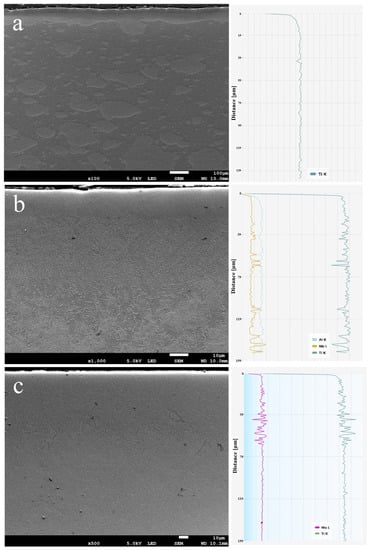 Cross-sections of laser-processed samples (on left; SEM) and results of chemical analyses (on right, EDS): (a) LT1, (b) LT2, (c) LT3.