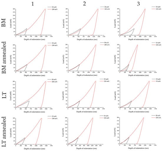Indentation curves of BM and LT samples and annealed BM and LT samples ((1)—Ti grade IV; (2)—Ti7Nb6Al; (3)—Ti15Mo) loaded with a maximum force of 50 and 200 mN.