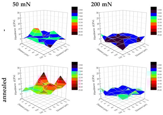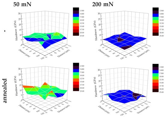 The obtained 3D distributions of the tested materials indicated an uneven distribution of mechanical properties (nanohardness) on the tested surface. As the force increased (from 50 to 200 mN), an increase in the uniformity of the distribution of the tested properties was observed for all groups of specimens. This was probably due to a decrease in the influence of the roughness of the tested surface with an increase in the maximum force, which influenced the increase in the maximum depth of the measurement performed. In the case of samples after laser treatment (Figure 7), a more uneven distribution of properties was obtained, which, due to the increase in the surface roughness after the laser treatment process, confirmed the previous hypothesis. The 3D distribution maps presented for Ti specimens for all cases studied showed an increase in hardness after annealing, which was greater for measurements performed with a lower maximum force (50 mN). The increase in hardness after annealing was already observed in a previous study [27] with a simultaneous reduction in residual tensile stresses. Similar results have been previously reported; the higher the annealing temperature, the greater the hardness, the effect disappearing only for annealing over 1000 °C, and the effect was attributed to the formation of martensite during cooling following annealing [38]. Moreover, it might also be the effect of the rearrangement of the dislocated structure within a thin subsurface layer, mainly its movement towards the surface, stopping and interacting, resulting in the appearance of surface cracks.