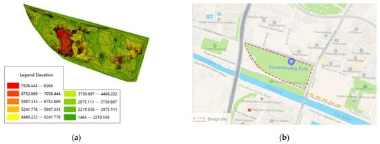 Shuixizhuang Park is a district park to be built in Hongqiao District, Tianjin, China. It is adjacent to Memorial Hall Road to the north, the Ziya River to the south, Xihe Bridge on Xianyang North Road to the east, and Tianhe Bridge on the Northwest-Half-Ring Expressway (Qianli Di Road) to the west, connecting to the plot on the south side across the Ziya River. The east side of the park is land to be developed. Based on the 1:500 topographic map created in 2017 (Figure 1a), the park covers an area of 26.5 hectares. The park site is generally flat, with topographic changes in the southwest and southeast, and a height difference of about 3 m. The slope of the whole park ranges from 0.04% to 35.18%. There is a concave site in the middle of the park with 2 ponds, covering an area of about 1.85 hectares.
