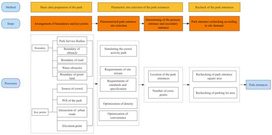 Considering the intricate variables that impact site selection, a parametric approach is employed to comprehensively evaluate pivotal factors pertaining to the positioning of the park entrance. If the entrance of the park is solely determined by the designers’ subjective experience and perceptual cognition of the environment, the omission of landscape design, the requirements for the park entrance square, and external access to the park may impede future planning and design efforts. A parametric approach would offer superior support in meeting visitor needs and enhancing accessibility to the park.