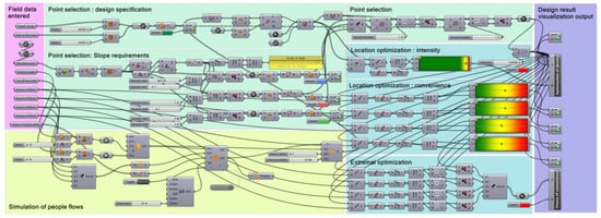 The selection of a suitable site for the entrance to a park is a complex process that requires a comprehensive analysis of various factors to obtain an optimized plan. However, the traditional empirical methods used by designers to analyze factors such as people flow direction and terrain often lead to inconsistent results. With the advancement of computer technology and data analysis, parametric design has become a popular trend in design [7,8,9]. By utilizing data analysis, quantifying indicators, and adjusting parameters, computers can assist in analyzing site functions in various designs, making this approach a research hot spot in the design field [10]. This shift in methodology is changing the traditional approach that relies solely on the designer’s experience to analyze site conditions and determine the design outcomes, making it more efficient and accurate.