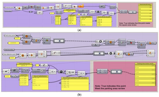 Utilizing the formulas discussed, we constructed the Square Area Review Algorithm Model (SARAM) (Figure 4a) and the Parking Lot Review Algorithm Model (PLRAM) (Figure 4b) on the R+G platform.
