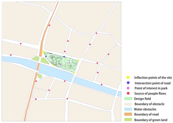 Based on the surrounding environment and current situation of the park site, 15 key points were identified along with 3 points of interests (POI) within the park. The key points were determined based on crowd flow from nearby residential and business districts. The district with higher crowd flow would have 2–3 key points while others would have 1 key point. These key points served as starting points for crowd simulation. The three POI within the park include the highest point of the park which may be designed as a scenic spot, the central pool zone which may be utilized as a water game zone, and the flat area in the northwest which may be planned as an activity zone. These three POI served as terminal points for crowd simulation (Figure 5).