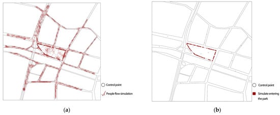We ran the Physarealm Algorithm Model (PAM) [29,30] until the crowd paths stabilized and simulated the crowd paths from the scattered surrounding areas (the 15 key points) to the park (3 POI within the park) (Figure 6a). The crowd paths intersect with the park borders, creating cross points where visitors can enter and exit the park (Figure 6b).