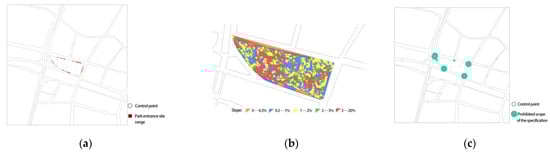 Around the Shuixizhuang park, there are seven road intersections that affect the entrance location, with five being major road intersections and two being general road intersections. We set the minimum distance from the entrances to 80 m for the major road and 30 m for the general road [27], and screened areas where park entrances are prohibited (Figure 7b).