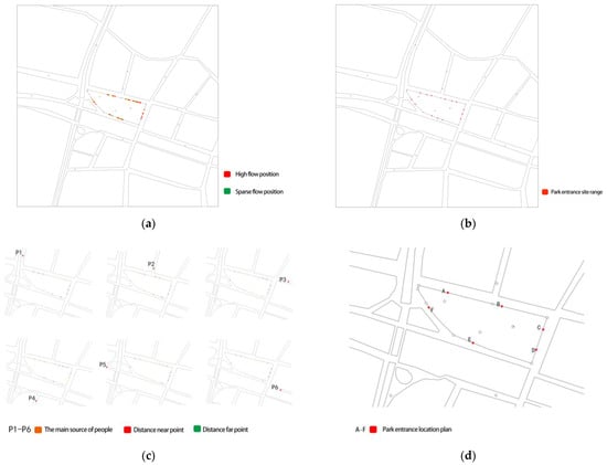 Based on the aforementioned considerations, a total of six park entrance points (A–F) meeting the above requirements were identified through screening (Figure 8d).