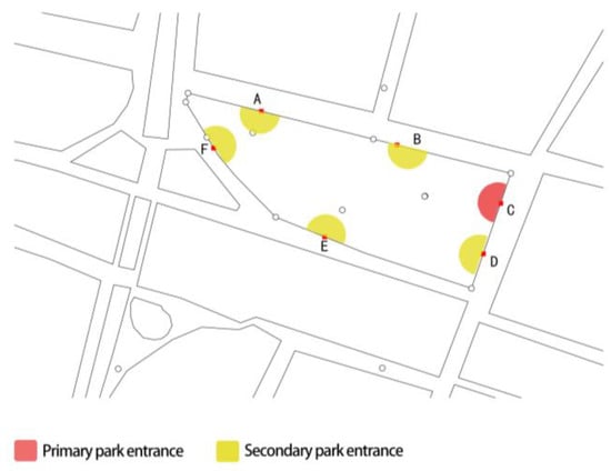 By computing the distance ratio from the northwest corner (i.e., the street corner near point A) to points B and F (which is inversely proportional to the park entrance square area), we calculated the area increase resulting from allocation of the square area at points B and F. Following the allocation, the entrance areas for B and F were 276.52 m2 and 1039.64 m2, respectively, and the resulting total entrance square area for B and F was 1592.68 m2 and 1666.8 m2, respectively.