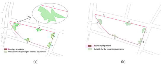 Calculating the parking lot area: When planning urban comprehensive parks, it is important to consider the parking needs of visitors. According to the specification, “Parking lots should be set up within 50–100 m of the park entrance, and the area of the gather and evacuation square should not be occupied”. Additionally, “The flatness of the parking lot site ground should be between 0.3–3%” [27].
