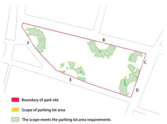 According to Formula (4), the park requires a parking lot area of 2484.3 m2. Considering the positive correlation between the parking lot area and crowd, the parking lot area at each entrance was also calculated based on the proportion of the crowd. As point A could not be used as an entrance, its parking lot area was assigned to adjacent points B and F using the same allocation method. After the redistribution, the parking lot areas at entrances B, C, D, E, and F are 159 m2, 633.5 m2, 665.8 m2, 303.1 m2, and 722.9 m2, respectively.