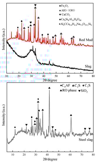The ground-granulated blast furnace slag was from Guigang Iron and Steel Technology Group, Guiyang, China, and was ground to a specific surface area of 400 m2/kg with a density of 2.91 g/cm3 using a ball mill. The Bayer red mud was from Guangxi Baise Pingguo Aluminum Company, China, and was ground to a specific surface area of 670 m2/kg with a density of 3.11 g/cm3 using a ball mill. The converter steel slag, ground to 600 mesh, was from Guangxi Liuzhou Iron and Steel Company, China, with a specific surface area of 499 m2/kg and a density of 3.26 g/cm3. The main chemical elemental compositions of red mud, blast furnace slag and steel slag were determined by X-ray fluorescence spectroscopy (XRF), and the results are shown in Table 1. The main phase compositions were determined by XRD, and the results are shown in Figure 1. In this paper, a mixture of sodium silicate and NaOH was chosen as the activator. The ratio of total SiO2 to total Na2O of the activator mixture was 1.5. The modified component was Aladdin’s USP-grade sodium stearate (density: 1.103 g/cm3).