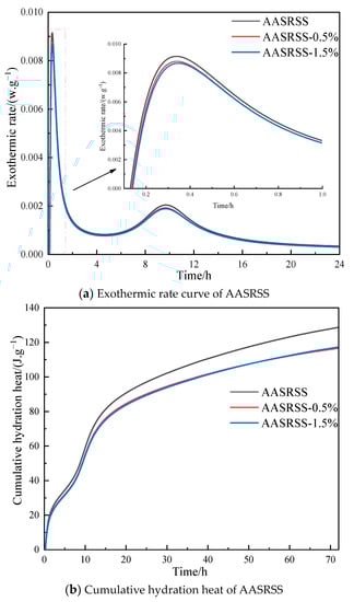 - The incorporation of NaSt did not change the type of hydration products of AASRSS, and the trend in the exothermic rate and cumulative exothermic curve of the hydration exothermic process did not change either, but it had some adverse effects on the intensity of the exothermic activity peak and cumulative hydration exothermic heat.