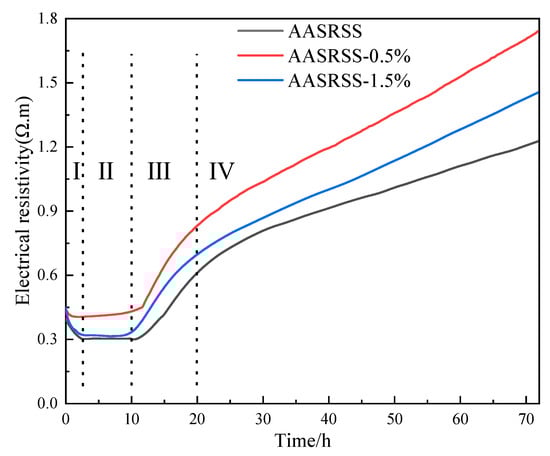 It is well recognized that the electrical resistivity of AASRSS during the hydration process is related to the ion concentration in the solution and the pore structure of the hardened matrix. The lower the ionic concentration and the lower the pore transport in the matrix, the higher the resistivity of the AASRSS hydration system, and vice versa [27,28]. As can be seen from Figure 5, the resistivity profile of the AASRSS control group could be divided into four stages: