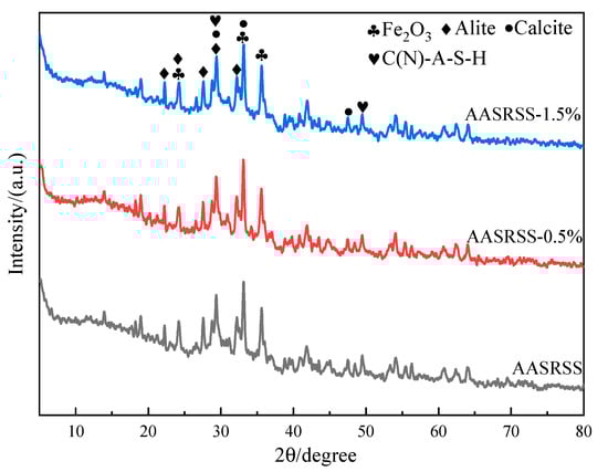 The XRD results of the 28-day AASRSS samples are shown in Figure 6. Calcite (CaCO3, 2θ = 29.41° and 47.5°), alite (2θ = 22.24°, 27.55°, 29.36° and 32.21°) and hematite (Fe2O3, 2θ = 24.2°, 33.12°, 35.6° and 49.52°) could be detected. An important indication in Figure 6 is the peak in the X-ray diffraction pattern at 30° and 49.5°, which is attributed to C(N)-A-S-H. The difference in the intensity of this peak is somewhat indicative of the amount of C(N)-A-S-H gel produced; specifically, the intensity of C(N)-A-S-H slightly decreased with the addition of NaSt at around 30° and 49.5°. This indicates that the addition of NaSt slightly reduced the formation of C(N)-A-S-H in the AASRSS, which is consistent with the heat-of-hydration results.