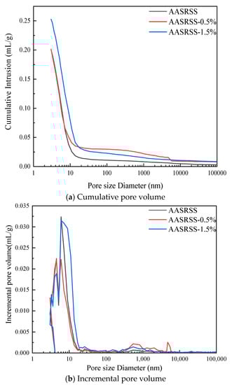The results of the MIP tests are shown in Figure 8. As shown in Figure 8a, the AASRSS with 0.5 wt.% NaSt added showed a comparable level of total cumulative pore volume to the control group, and the incorporation of 1.5 wt.% NaSt resulted in a larger porosity of the AASRSS. It is thus plausible that the combination of the increased porosity and reduced hydration products mainly accounted for the decrease in the compressive strength of the AASRSS due to the NaSt.