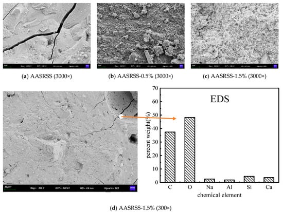 To further clarify the effect of NaSt on the pore structure of AASRSS, the microstructure was observed using SEM, and the results are shown in Figure 9. It can be clearly observed that, on one hand, with the incorporation of NaSt, the microcracking of AASRSS was reduced significantly; on the other hand, the matrix became denser and a large amount of micro-closed pores formed inside the specimen (darker part). EDS was used to determine the elements on the surface of the AASRSS pore wall. Since light elements such as C and O are sometimes difficult to detect due to their low energy, using EDS for light elements increases the acquisition time and reduces the acceleration voltage. To avoid the interference of C elements in air, we minimized the contact between the sample and air during the sample preparation. The EDS results show that the AASRSS pore wall contains a large amount of C elements. The trace carbonization that occurs during the sample preparation process should not produce so many C elements. Thus, the EDS results indicate that the pore wall is covered with a wax-like layer of a NaSt compound, which has hydrophobic groups [33]. All these together result in a decrease in the water sorptivity of AASRSS with the incorporation of NaSt.