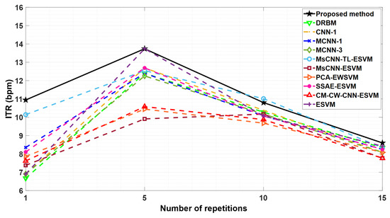 where is the number of repetitions, which has been assigned values of 1, 5, 10, and 15 for this investigation. In Figure 4, a comparison is made between the Information Transfer Rate achieved by the proposed method and those reported in earlier studies. The results indicate that the proposed approach yields a higher ITR than the other techniques. Specifically, the proposed method exhibits the highest ITR at all repetitions, as evidenced by the values of 10.9 bpm, 13.7 bpm, 10.7 bpm, and 8.6 bpm for 1, 5, 10, and 15 repetitions, respectively. These findings suggest that the system’s speed and character recognition accuracy are optimized across all repetitions.