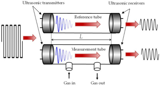The principle of ultrasonic gas detection is based on sound velocity measurements. Sound velocity measurement methods can be divided into threshold detection (TH) methods and phase difference (PD) methods [21]. The difference between the two types of methods is that TH methods send an ultrasonic pulse group, while PD methods send a continuous ultrasonic wave, and the gas concentration is indicated by measuring the signal delay between the transmitter and the receiver. In terms of detection accuracy and resolution, PD methods are better than TH methods. Furthermore, threshold detection methods require a high-frequency ultrasonic probe, which has a high cost. Therefore, a PD method was chosen for this study.