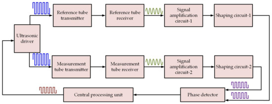 The ultrasonic transmitter was set to a continuous-wave working mode, and an ultrasonic receiver was placed at the other end of the acoustic tube to detect the transmitted ultrasonic signal. Due to the attenuation of acoustic energy during transmission, the amplitude of the received ultrasonic signal was relatively low after passing through the acoustic tube. Thus, the received signal was sent to a signal amplification circuit for amplitude amplification. Since the phase detector we use is designed using a D trigger, the input signal must be a square wave signal. Therefore, the amplified signal was then sent to the shaping circuit to convert the sine wave signal into a square wave signal. The phase difference between the signals of the dual-channel acoustic tubes was then obtained through a phase detector. The circuit composition of the ultrasonic sensor module is shown in Figure 2.