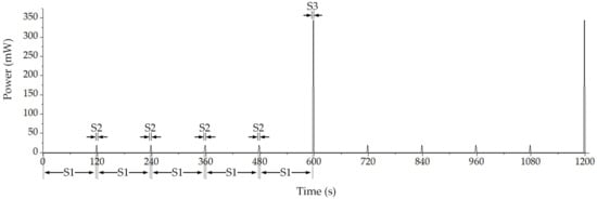 The components marked with √ in Table 2 are in the active state; S1 indicates the sleep state, S2 indicates the working state of the ultrasonic sensor module, S3 indicates the joint working state of the methane sensor, carbon dioxide sensor, and temperature and humidity sensor, and S4 indicates the data communication state. The time duration is the continuous working time of an active component in a state, and the cycle time is the length of time that elapses until this state is restarted. Considering that the temperature and humidity of a sewer vary slowly, it is not necessary to measure the temperature and humidity frequently. Since the carbon dioxide sensor consumed a large amount of power, the cycle time for S3 was set to be relatively long. We set the S3 state to be executed after every four repetitions of S1 and S2; thus, it could both compensate for temperature and humidity and reduce the system’s power consumption. The relationship between time and power consumption in S3 is shown in Figure 4. Since the power consumption of the Zigbee module was high, the cycle time of S4 was set to 6 h (i.e., sending monitoring data every 6 h) if the sewer gas concentration was normal, and the Zigbee module was in the sleep state for the rest of the time. Table 3 shows the power consumption analysis of these four operating states.