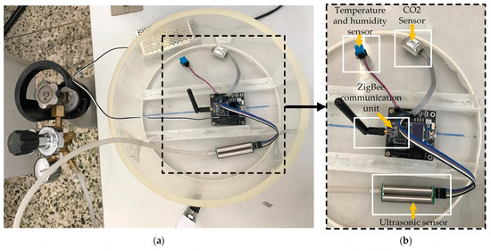 Laboratory test device: (a) experimental architecture; (b) sensor detection node components.
