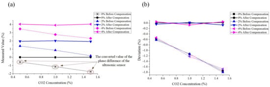 Figure 6a shows the actual measured values of methane concentrations with different carbon dioxide concentrations, and the deviations shown in Figure 6b are the difference between the measured value and the actual value. The dotted line represents the measured value before correction and the solid line represents the measured value after correction. A measurement result is marked with * if the measured dual-channel phase difference was converted into a negative value. In the measurement results, there was a large deviation before carbon dioxide correction, and the measured values decreased as the concentration of carbon dioxide increased. As shown in Figure 6a, if the methane concentration was zero, the measured values were all negative. This was because the sound velocity of carbon dioxide is lower than that of air, and the phase of the measuring acoustic tube signal lags behind the phase of the reference acoustic tube signal. When there was only carbon dioxide in the gas mixture with no methane present, or the concentration of methane was quite low, the measured value obtained after the calculation was a negative value. It can be seen that the system exhibited good correction with different carbon dioxide concentrations and that the measurement results were more accurate after carbon dioxide correction, thus achieving the requirements for methane gas concentration detection at higher carbon dioxide concentrations.