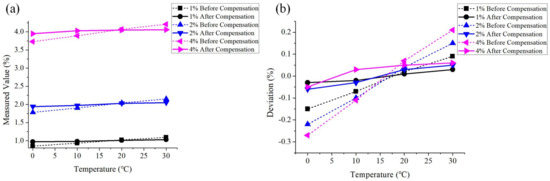 For the temperature compensation test, we selected the temperatures of 0 °C, 10 °C, 20 °C, and 30 °C to test the system’s methane measurement accuracy at a relative humidity of 75%. Figure 7 shows the measurement results before and after temperature compensation. The dotted line represents the measured value before temperature compensation, and the solid line represents the measured value after temperature compensation. The deviation of the measured value before compensation was relatively large compared to the deviation of the measured value after compensation. The measured value before compensation increased as the temperature increased, and the deviation was minimal when the temperature approached 20 °C. This was because the zero-point calibration of the sensor before testing was at a temperature of 20 °C. The compensated deviation was less affected by the temperature. It could be seen that temperature compensation could further reduce the impacts of temperature changes and improve sensor accuracy. Furthermore, even though the measured values’ deviation before the compensation was large, the accuracy was still high; the dual-channel acoustic tube structure was able to achieve good temperature compensation.