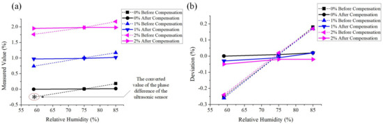 At an ambient temperature of 20 °C, three saturated salt solutions were selected to attain relative humidity of 59% (sodium bromide), 75% (sodium chloride), and 85% (potassium chloride) in order to verify the humidity compensation performance. The measurement results before and after humidity compensation are shown in Figure 8. Since the zero calibration was performed in an environment with a relative humidity of 75%, measurement deviations before and after compensation were not significantly different at 75% relative humidity. When relative humidity was 59% or 85%, the deviation before compensation was quite large, and the value of the deviation increased as the humidity increased. After humidity compensation, the impact of humidity on the measurement results was significantly reduced.